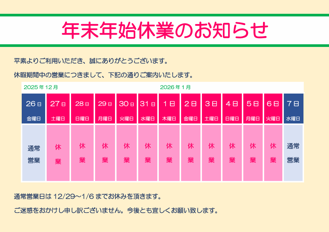 休業期間:2025年12月27日(土)~2026年1月6日(火)